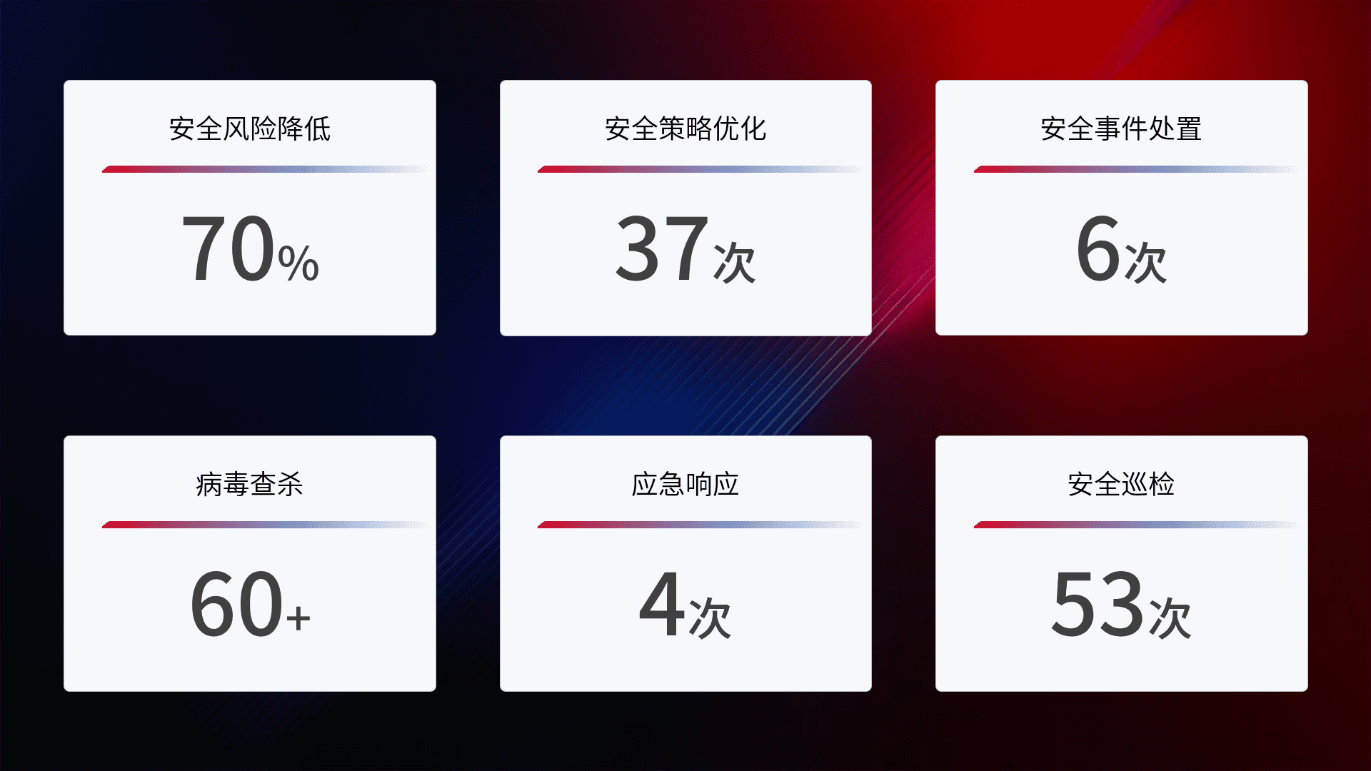 提供全面的安全事件报告体系,,,包括处置报告、、周报、、、季度和年度总结,,,,结合持续监控,,帮助客户深入了解网络安全状况。。。。