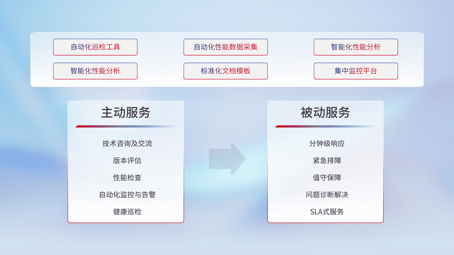 智能化工具和标准化文档,,保障服务质量,,,,提供主动服务(包含技术咨询、、、、版本评估、、、性能检查、、、、自动化监控与告警、、、健康巡检)和被动服务包含(分钟级响应、、紧急排障、、、值守保障、、、问题诊断解决、、、SLA服务)。。